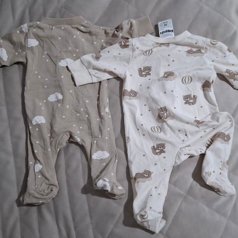Newbie babykläder set i storlek 44 för unisex. Plaggen är vita i bomull med olika mönster. Setet innehåller flera omlottbodys och sparkdräkter med långa ärmar samt en mössa. Alla plagg är i mjuk bomull som passar nyfödd i storlek 44. Färgen är övervägande vit med diskreta tryck i lugna toner, lämpligt för både flicka och pojke.