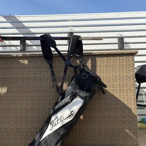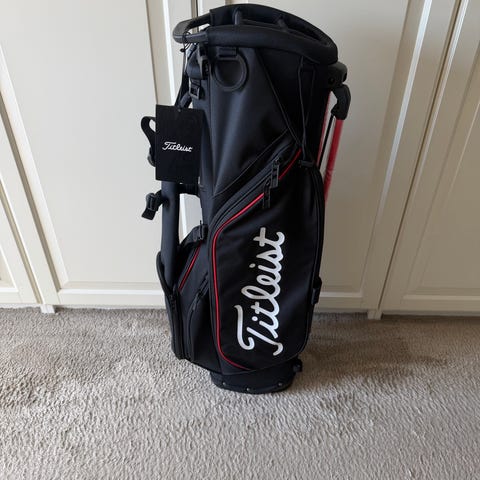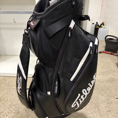 Titleist golfbag i svart färg. Väskan har axelrem och flera ytterfack för förvaring av golfutrustning och tillbehör. Passar för transport och förvaring av golfklubbor på bana och range.