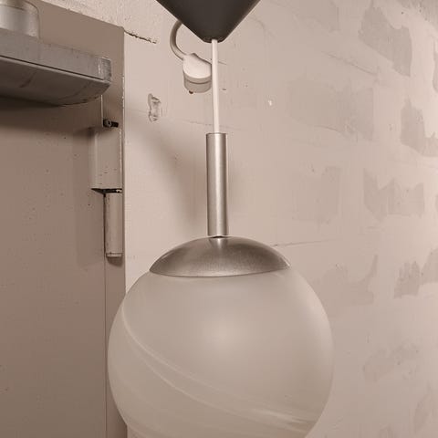 Säljer lampa i vitt glas och metall. Inköpt på ikea eller Mio för ca tre år sedan. Hela lampan är ca 57 cm ner från taket.