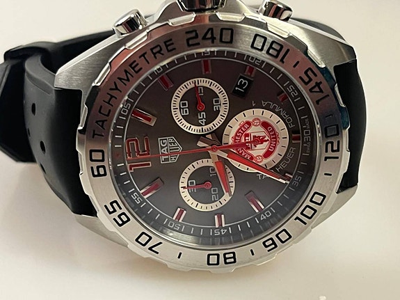 En lyxig 40,5 mm kvartsklocka med alarm inspirerad av den högtrycksvärlden inom professionella vattensporter. Den vridbara stålringen är markerad med överdimensionerade arabiska siffror och roterar bara i en riktning – viktigt för att undvika dykolyckor. Klockan är helt ny och uttagen 2022 men aldrig använd, kommer full set. Mvh