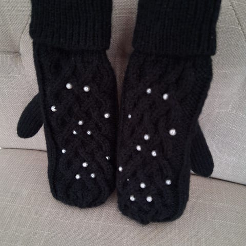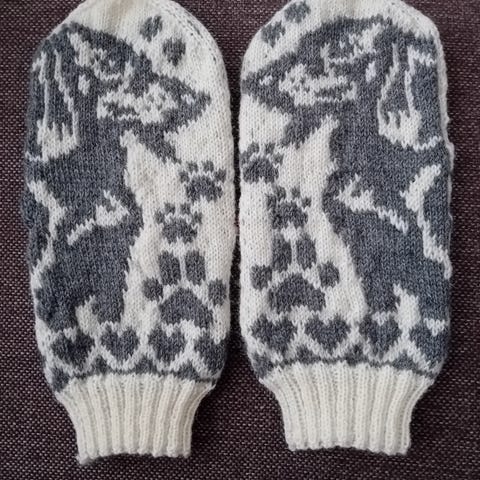 Nya mönsterstickade rumvantar mönster chihuahua , garn i ull strlk M. Färgen beige o brunt. Bild tagen utan tummar så texten syns bättre.