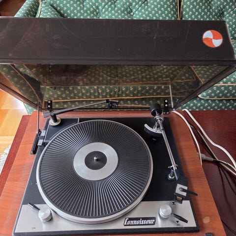 Fin liten fjäderupphängd skivspelare från Philips. Fattigmans thorens kallades den har jag läst. Touch-knappar för start och stopp och varvtals-byte, rätt cool teknik för att vara så gamal. Väldigt snygg estetiskt.