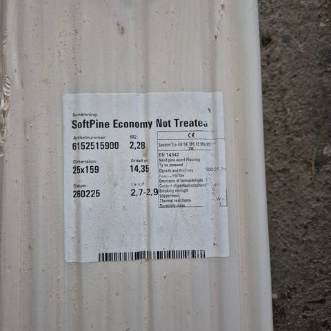• Längd: 3,6 m• Bredd: 95 mm• Tjocklek: 14 mm• Skick: Oanvända