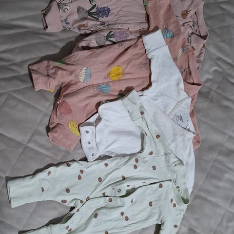 Newbie babykläder set i storlek 50-56 för flicka. Plaggen är i bomull och kommer i flera färger och mönster, bland annat enfärgade och mönstrade bodys samt sparkdräkter/pyjamaser. Lämpliga som vardagskläder för spädbarn, med lång ärm och mjukt material som passar för inomhusbruk och lager-på-lager-klädsel. Setet innehåller flera delar i samordnade färger och mönster.