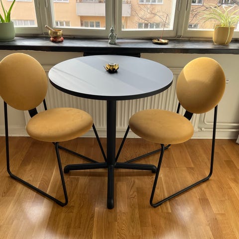 Runt svart cafébord + 2 st gula stolar – stilrent set