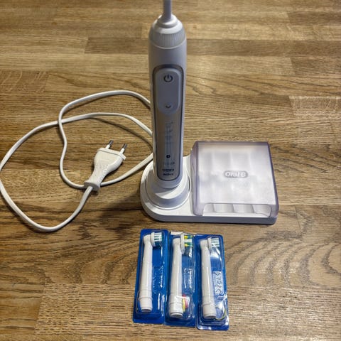 elektrisk tandborste i svart färg. Levereras med laddkabel och flera utbytbara borsthuvuden enligt bild. Lämplig för daglig tandborstning och munhygien. Drivs av uppladdningsbart batteri och har flera borstlägen enligt information på förpackningen.