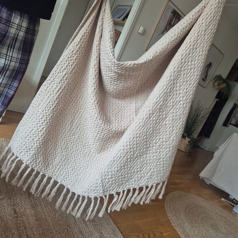 Grov Kabelstickad pläd från H&M med fransar 125 X 150 cm endast legat som prydnad .