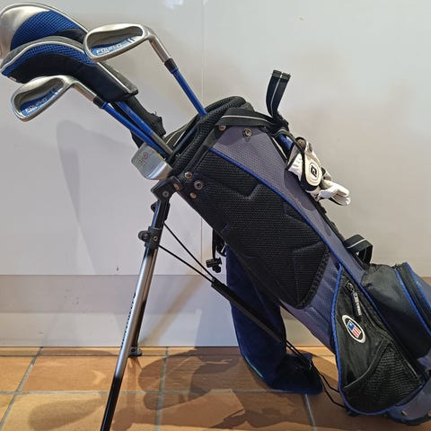 Golfset med bärbag och stativ i svart/blå färg. Setet består av fyra klubbor plus putter. Lämpligt ca 9-12 år, 400 kr