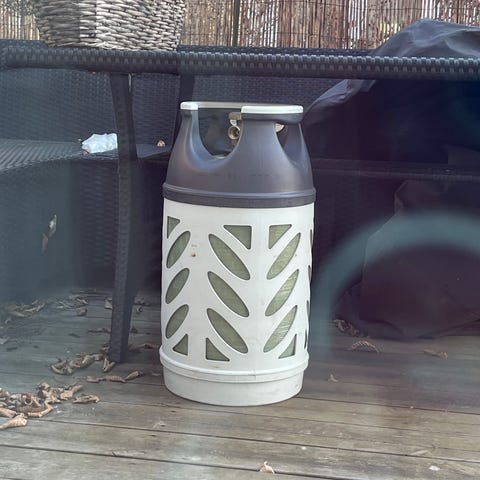 Gasolflaska i stål i grå färg. Utrustad med ventil och bärhandtag upptill. Passar för användning till exempelvis gasolgrill, gasolspis eller värmare där rätt typ av anslutning och godkänd besiktning krävs. Exakt volym och tillverkningsår framgår inte av uppgifterna och bör kontrolleras på flaskans märkning.
