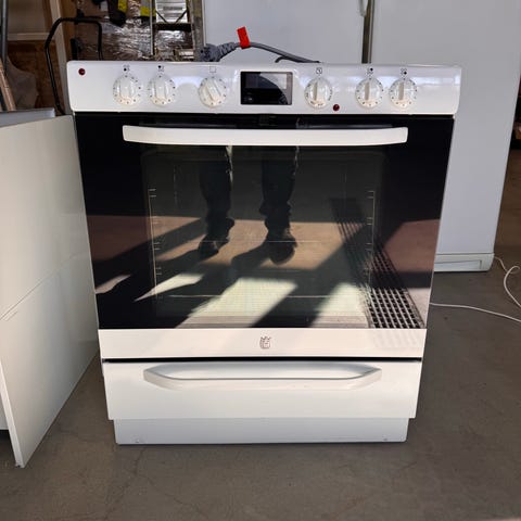 Spisen har fyrkantig ugnslucka med glasfront och vred på frontpanelen för inställning av plattor och ugn.