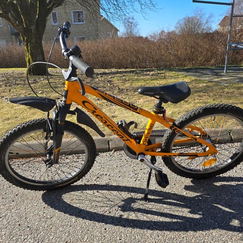 Crescent barncykel med 20" hjul. Cykeln har orange ram med svart sadel och styre med handtag i brun ton. Utrustad med skärmar, kedjeskydd, ringklocka och handbroms fram. Passar barn som behöver en mindre cykel med 20-tums hjul för vardagscykling och fritid.