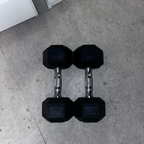 Domyos hantlar 10 kg i svart färg. Hantlarna har sexkantig form som motverkar att de rullar iväg och en greppyta på handtaget för bättre stabilitet. Passar för styrketräning av överkropp, ben och bål i hemmet eller på gym.