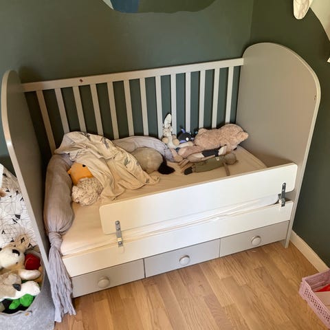 Ligga, sitta, klättra och stå – en spjälsäng som växer med barnet. Med sänkbar botten och avtagbar ena sida blir den smidig även när barnet kan ta sig i och ur själv.