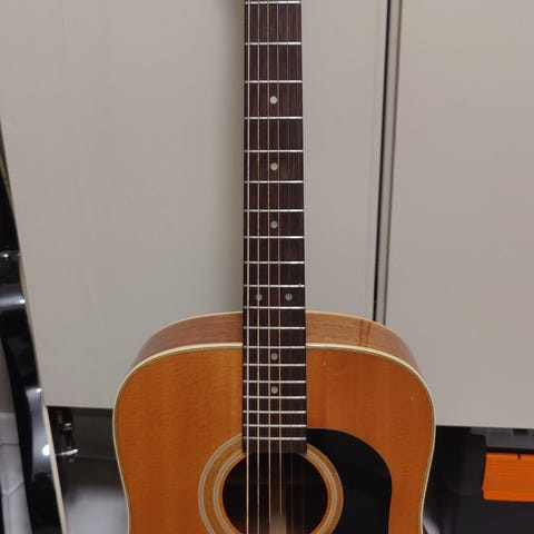 Akustisk gitarr av dreadnought-typ i naturträfinish. Gitarren har sex strängar, greppbräda med positionsmarkeringar och svart plektrumskydd. Kroppen är i trä med rund ljudhålsrosett och stålsträngar. Huvudet har sex mekaniker för stämning. Passar för allmän akustisk spelning, ackompanjemang och övning.
