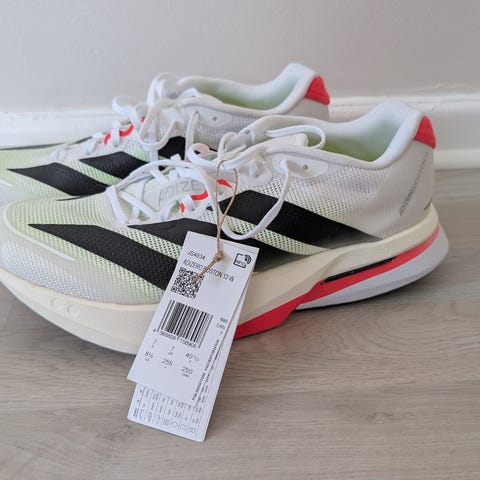 Adidas löparskor i storlek 44 2/3. Skorna är vita med lila och gröna detaljer. Avsedda för snabbare löpning. Yttersula i gummi och ovandel i syntet/mesh för lätt känsla och ventilation. Passar för löpning på väg eller bana.