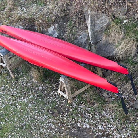 Tvåsitsig kajak i gul gelcoat. Haft den i familjen sen ny. Nya linor till roder. Skrovet och plasten är otroligt väl bevarad. Passar för två personer och kan användas för fritidspaddling eller träning.