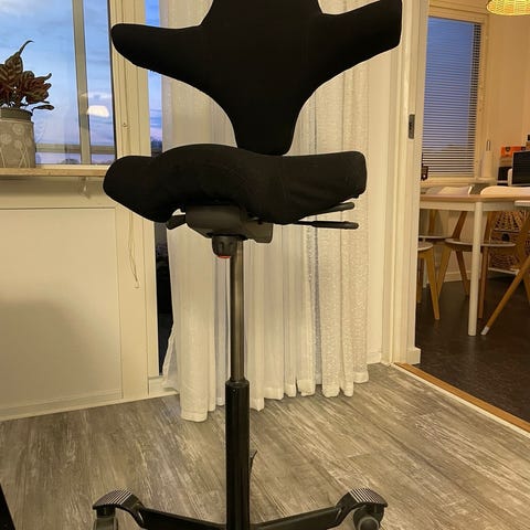 Be-Ge Frapett modell 7010 är en välkänd sadelstol som funnits på marknaden i många år. Säljs med justerbart ryggstöd. Tygklädsel (vilket jag fördrar då det är svalare att sitta på än läder/konstläder). Finns en liten nötning i tyget på ryggstödets ena sida.