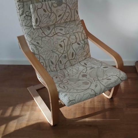 Stylish armchair with a solid curved wooden frame and soft seat, back, and head cushions. Neutral cream fabric with an elegant floral pattern fits most interiors. Comfortable and well maintained—perfect for a living room or reading corner.