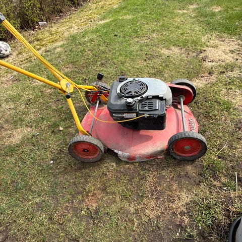 Gräsklipparen startar inte just nu, men borde fungera efter service. Lite bensin och olja följer med.