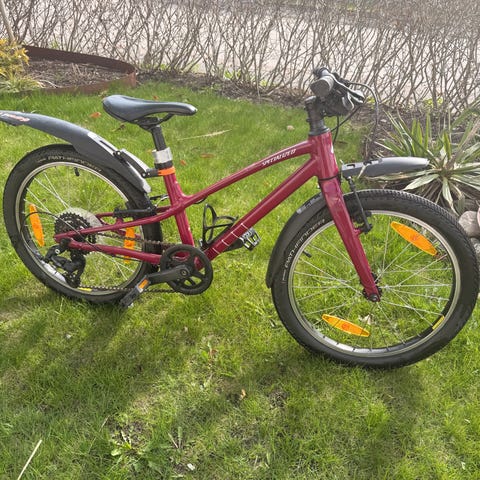 Orbea barncykel med 20" hjul i röd färg. Cykeln har låg ram anpassad för barn och raka styren för upprätt körställning. Utrustad med fotstöd och reflexer. 7 växlad. Med handbroms. Passar lika bra som vardagscykel och skogskörning