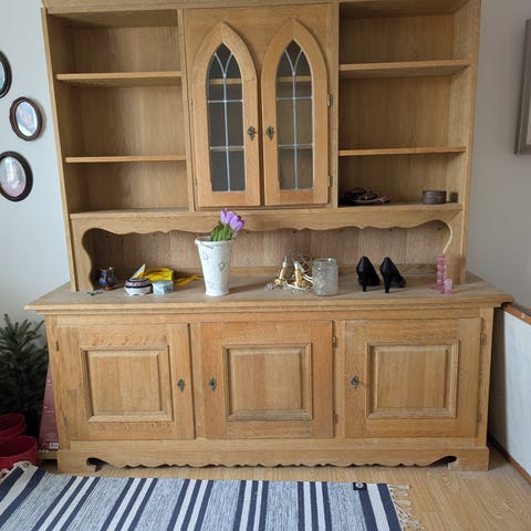 Bra förvaringsmöbel i vardagsrum eller matsal. Har använts länge och har flera skavanker.