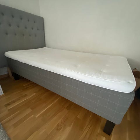 IKEA Espevär säng med bäddmadrass i grått utförande. Sängen har en stoppad sängram med tygklädsel och står på mörka ben. Bäddmadrassen är ljus och quiltad med jämna kanaler.