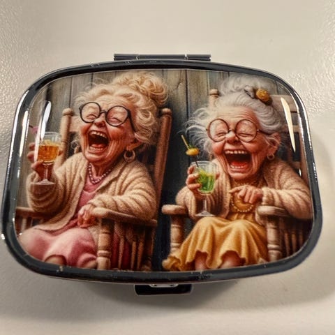 Pillerask med dödskallemotiv i flerfärgad design. Rektangulär modell med metallram och snäpplås. Insidan har två fack för separering av tabletter eller småsaker. Passar för förvaring av exempelvis medicin, vitaminer eller små tillbehör vid resor eller i vardagen.