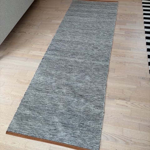 Grå matta i 100% bomull från Åhléns, mått enligt ovan. Sparsamt använd.