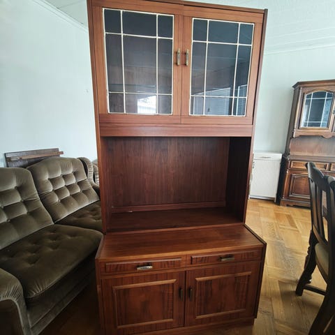 Vitrinskåp i trä med glasdörrar och två lådor nederst. Skåpet har hyllplan bakom glasdörrarna för förvaring och exponering av porslin, glas eller andra föremål. Nedre delen består av lådor som ger extra förvaringsutrymme. Passar i vardagsrum, matsal eller kök som förvarings- och displaymöbel.
