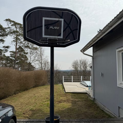 Pure basketkorg med ställning. Fristående basketställ med rektangulär tavla, nät och fot som kan fyllas för stabilitet. Passar för användning på uppfart, gård eller liknande ytor för basketspel utomhus.