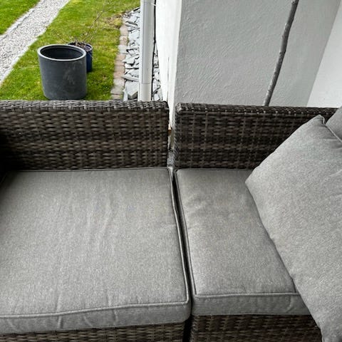 Liten svart rottingsoffa säljes. Jag har bifogat bilder på ett par ställen där flätorna har gått sönder.