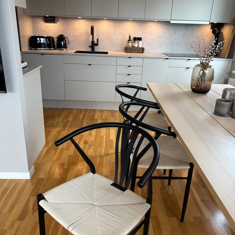 6 st stolar. Stabila och gedigna . Ovanligt tunga för att vara köksstolar . Förmodligen omålade blåa . Lite skav o skavanker i färgen.100:-/st.