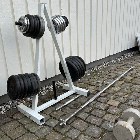 0,5 kg, 1kg, 2kg. Stången väger 1,5 kg