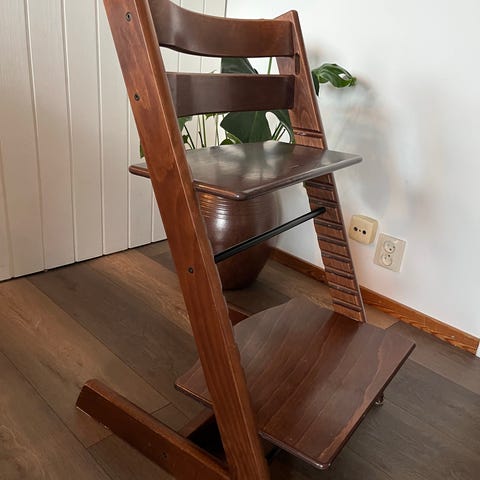 Stokke trip trapp stol med bygel och rem. Vit, och ommålad vit. Barnstolen har justerbar sitt- och fotplatta samt rem framtill för ökad säkerhet. Passar vid de flesta matbord och kan användas av barn som kan sitta själva och uppåt, beroende på inställning av höjd och djup på sitt- och fotplatta. Se bild för skick