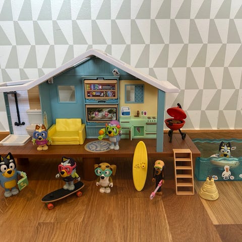Bluey leksakshus med tillbehör/inredning och flera små figurer.