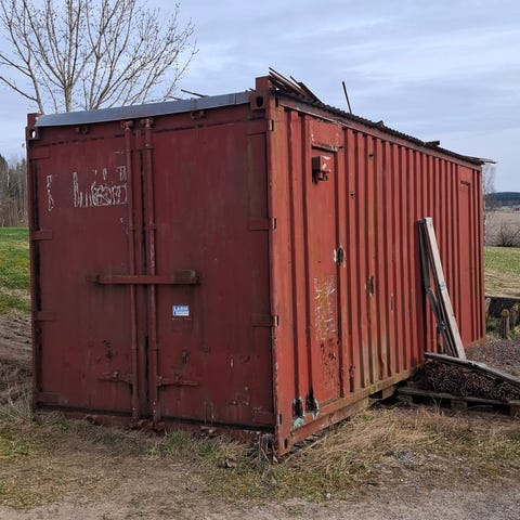 Fraktcontainer i stål i grå färg. Containern har dubbeldörrar på kortsidan med låsbommar. Utsidan visar spår av rost och väderpåverkan. Lämplig som förvaringsutrymme eller lagringslösning på exempelvis byggarbetsplats, gård eller industriområde.