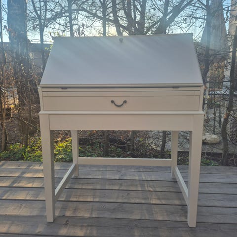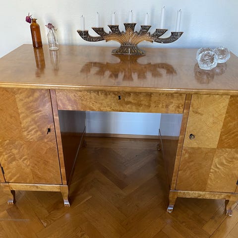 Fin sekretär i ljust trä, perfekt att använda som skrivbord med generös förvaring. 6 små lådor och 2 stora, låsbar med medföljande nyckel.