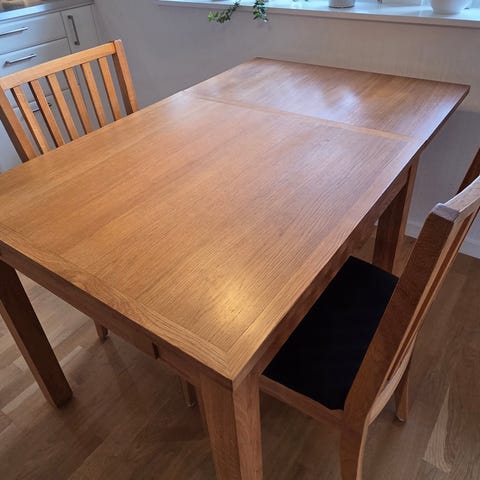 Matgrupp med rektangulärt matbord och matchande stolar. Bordsskivan är i trä med synlig trästruktur och benen är vitmålade. Stolarna har sits i trä och vitmålad stomme med ribbad rygg. Passar som matplats i kök eller vardagsrum.
