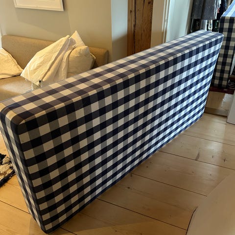 Hästens säng med bäddmadrass. Enkelsäng med rektangulär form, placerad på ben. Bäddmadrassen har rutigt mönster i ljusgul och vit ton. Passar som vanlig säng i sovrum eller gästrum.