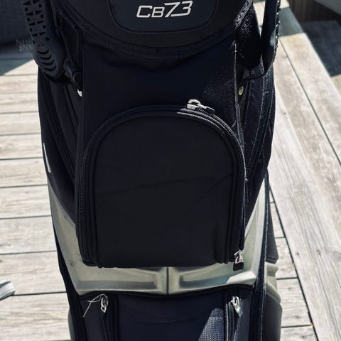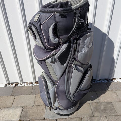 Masters golfbag med tillhörande golfvagn i svart färg. Bagen har flera ytterfickor med dragkedja för förvaring av bollar, handskar och andra tillbehör. Överdelen har flera fack för klubbor samt bärhandtag. Golfvagnen är en trehjulig modell med ställning anpassad för bagen och remmar för fastsättning. Utrustningen är avsedd för användning på golfbana för transport och organisering av golfklubbor och tillbehör.