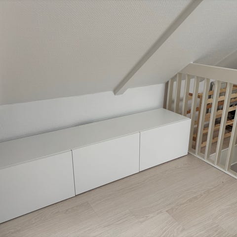 IKEA EKET väggmonterade kubhyllor i vit färg. Består av fyrkantiga hyllmoduler som kan monteras direkt på väggen. Passar för förvaring av böcker, dekorationer eller mindre föremål i exempelvis vardagsrum, hall eller sovrum. Hyllorna kan placeras i rad eller i olika nivåer beroende på vägg och utrymme. Materialet är lackerad skiva med dolda fästhål på baksidan för upphängning.