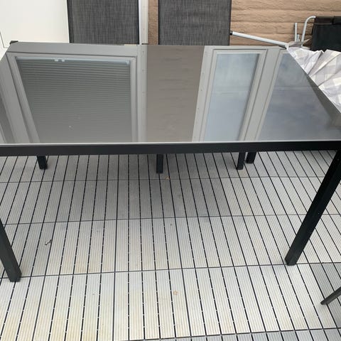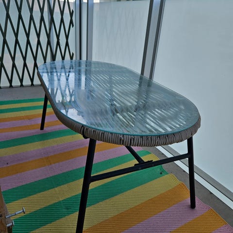 Tillverkat i svart konstrotting med handvävd design och en glasskiva ovanpå.