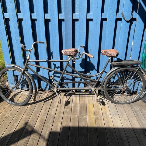 tandemcykel för unisex med ramstorlek L och 26" hjul. Cykeln har två sadlar och två uppsättningar pedaler för två personer. Utrustad med styre fram, framlykta och pakethållare bak. Passar för vardagscykling och transporter där två personer cyklar tillsammans.