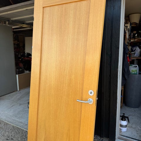 3 st dörrblad i trä, en dörr med vred (visas på bilden) och två utan vred, handtag ingår. Modulmått: M7