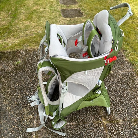 Osprey Poco bärstol för barn i blå och grå färg. Bärstolen har vadderad sits och sele för barnet samt justerbart bärsystem med vadderade axelremmar och höftbälte för den som bär. Ryggpanelen är ventilerad och det finns flera remmar för anpassning av passform. Modellen har inbyggt ställ så att bärstolen kan stå stadigt på golv eller mark vid i- och urstigning. Nedtill finns förvaringsfack för packning och tillbehör. Lämplig för vandring och utflykter med mindre barn som kan sitta stadigt själv.