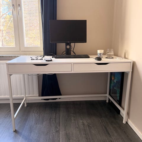 Säljer ett klassiskt IKEA Hemnes skrivbord i vitbets. Skrivbordet är stabilt och fyller sin funktion precis som det ska, men har sett en del användning genom åren.