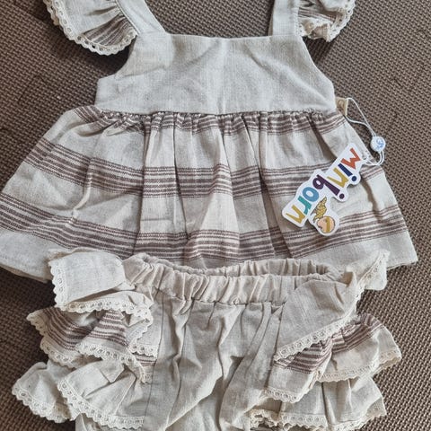 Jättefint set bestående av en vit tunika med volanger och knappar baktill, leggings med beige och vitt rutmönster samt matchande hårband. Överdelen oanvänd!