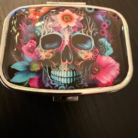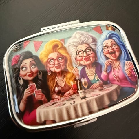 Pillerask i metall med två invändiga fack. Locket har ett färgat motiv som föreställer två äldre damer som sitter i stolar och håller drycker. Insidan är försedd med en vit insats som delar asken i två separata fack, lämplig för förvaring av tabletter eller små föremål.