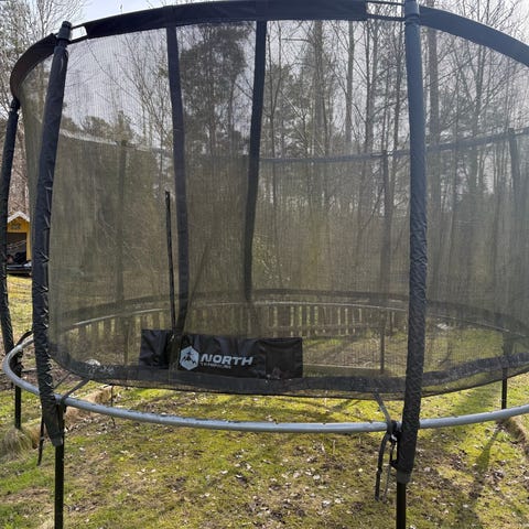 Salta Comfort Edition studsmatta med säkerhetsnät. Rektangulär studsmatta med skyddsnät runt hela hoppytan och vadderade stolpar. Stabil ramkonstruktion i metall och kantkudde som täcker fjädrarna. Passar för utomhusbruk i trädgård eller på tomt för hopp och lek. En av stagen som håller upp skyddsnätet behöver ersättas, kostnad ca 100kr. Annars i toppskick. Nypris