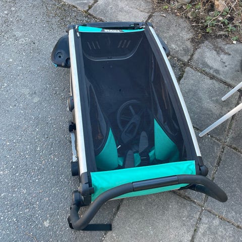 Cykelvagn med plats för två barn med separata säkerhetsbälten. Utrustad med genomskinligt frontskydd och tygöverdrag baktill. Fäste för montering på cykelns bakhjul ingår.